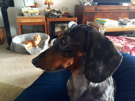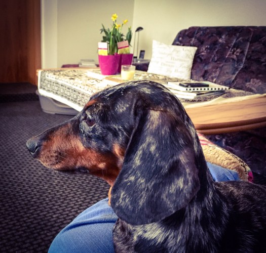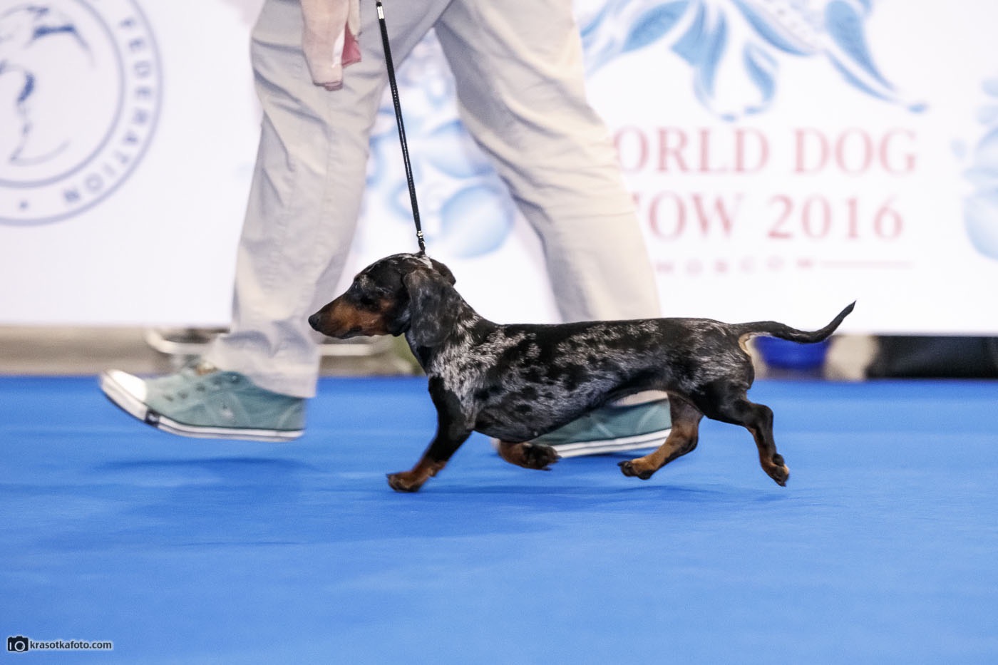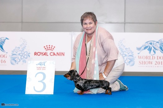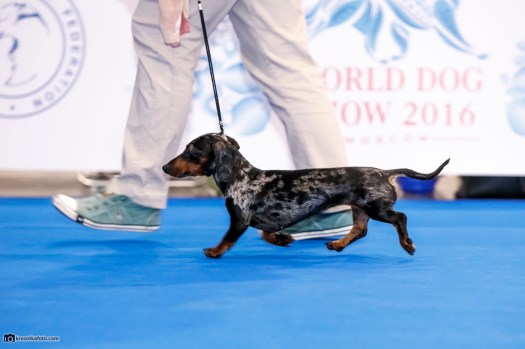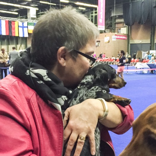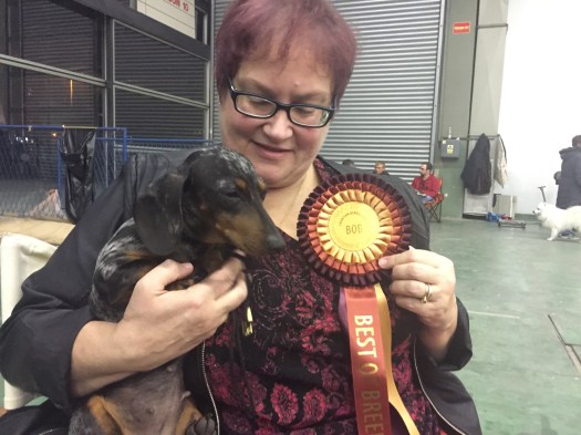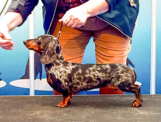 Yestie, as we know her, was born in August 2013. She was bred by Marika Stanovoi of the Dachshaus kennels, and is a lovely bright silver dapple. She is Champion of Croatia (’15), Estonia (’15), Belgium (’16); Grand Champion of Croatia (’17) and an FCI international champion (’17). She was Zagreb Winner ’14 and ’15; Croatian Club Winner ’14, ’15 and ’16; Continental Winner ’15; and she Crufts qualified every year she showed. In the big shows, she was 3rd in her Champion Class at the World Dog Show (Dachshund Speciality Moscow ’16) ; and she was 5th in Champion Class at the European Dog Show 2016 in Brussels. More important than her results, though, is the fact that she is the Queen of my Heart!