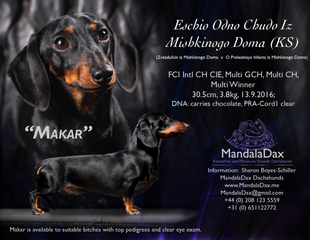 Makar is the father of our “C”, “D”, “E”, “F” and “H” litters and has also fathered several litters outside the MandalaDax family. Many of his progeny have gone on to become champions. His daughter Drama (from Yestie as well and sister to our Dreamer) was Best in Show at the Nederlandse Teckel Club Championship Match in held in August 2021, Drama is owned by Coby Satter-Mol and her daughter (Makar and Yestie’s granddaughter) is living at MandalaDax, young Dramatic Martini Uut de Slikhoek.