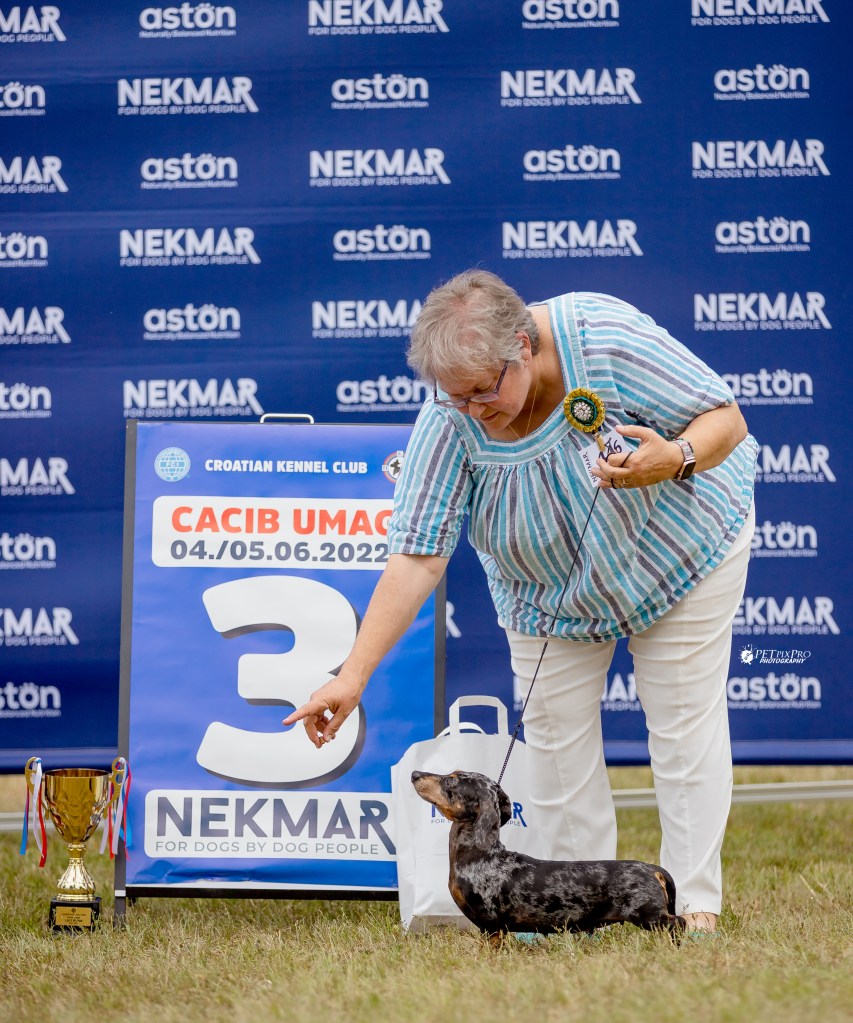 MandalaDax Antique Peony, KS, Black and Tan – she finally finished her Belgian Championship in May 2022 at the very same show where she won her first CACIB 5 years earlier (the photo below); she is Champion Croatia, Luxembourg, and now Belgium — along with Romania, Bosnia and Herzegovina, Republike Srpska and Federation Bosnia and Herzegovina, all of those closed in 2019-2022; she has Junior Championships from Belgium and Croatia and WUT; multiple Winner titles; qualified for Crufts in 2017 and 2018.